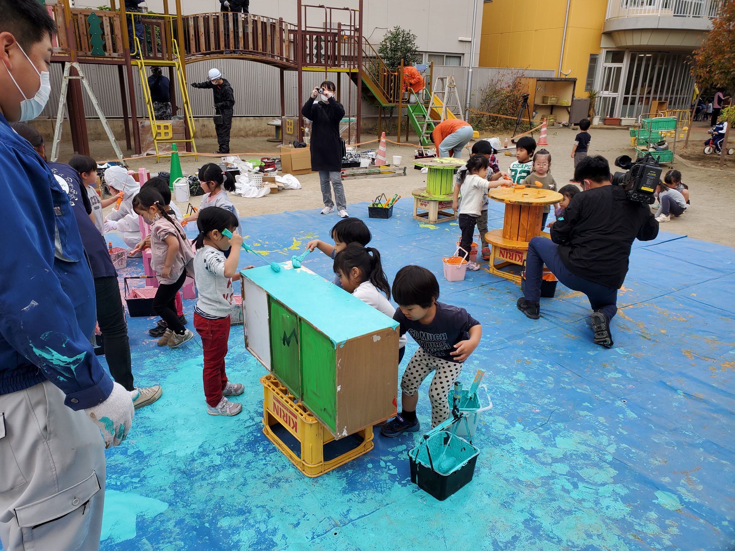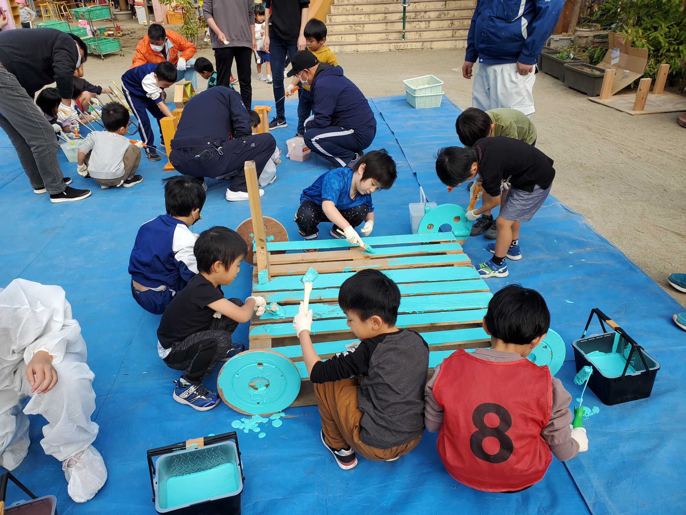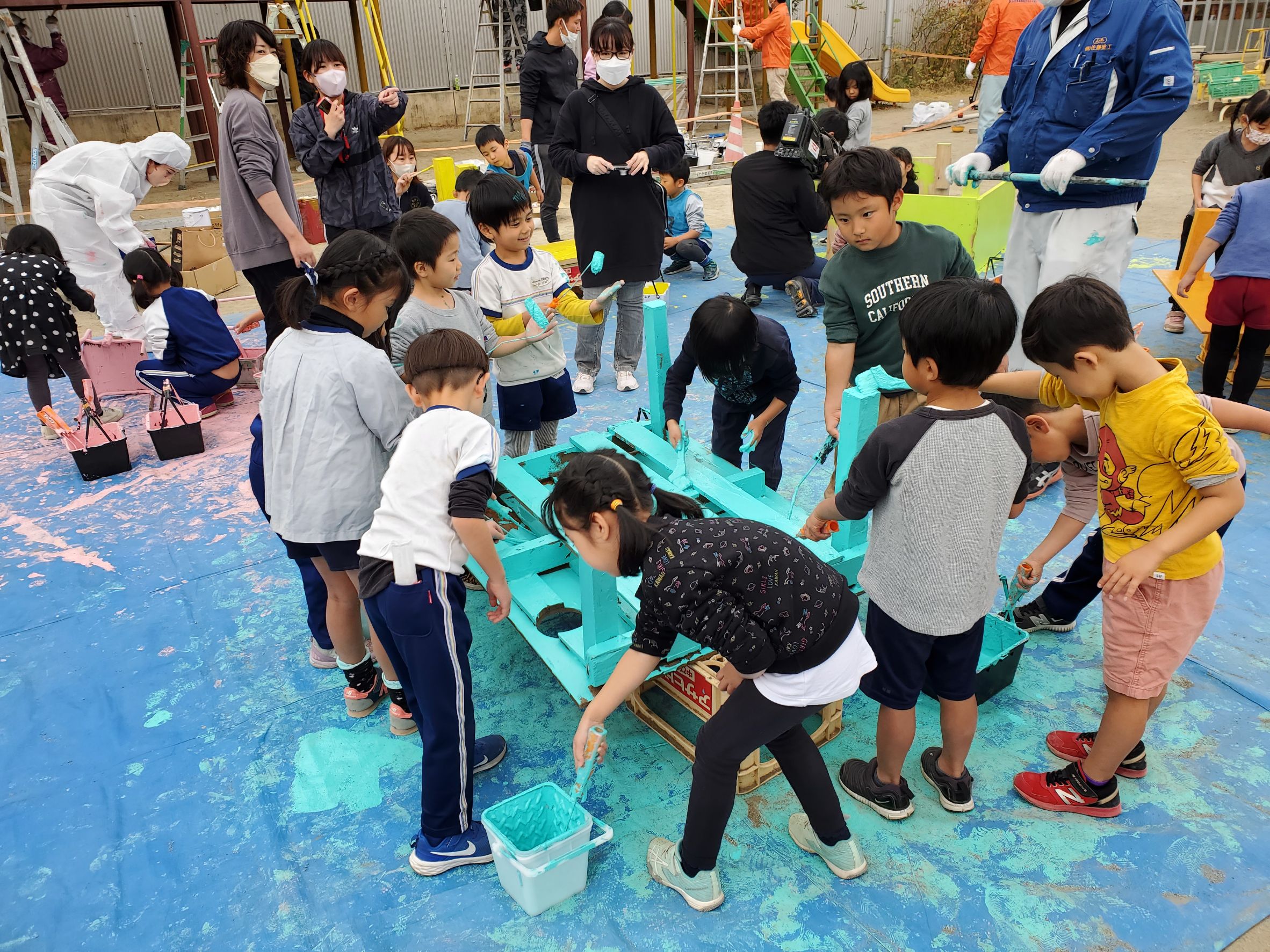遊具、棚、机、椅子などを刷毛やローラー使ってみんなで楽しく塗装してもらいました。