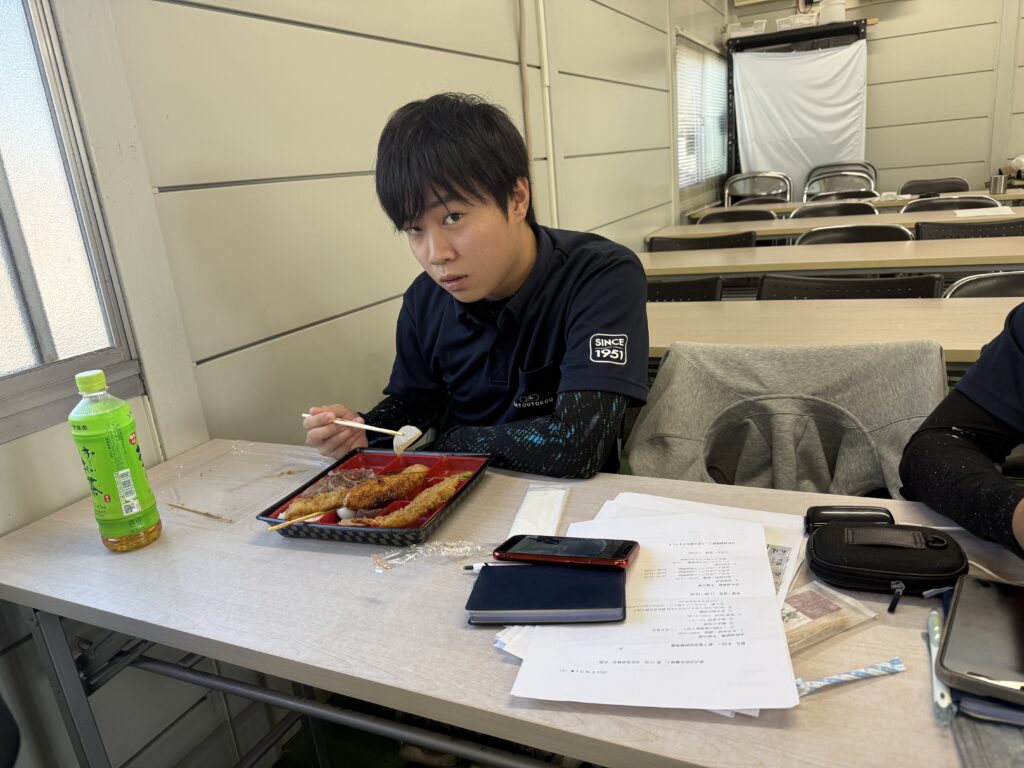 会社が準備したお弁当を食べ、午後に備えます!