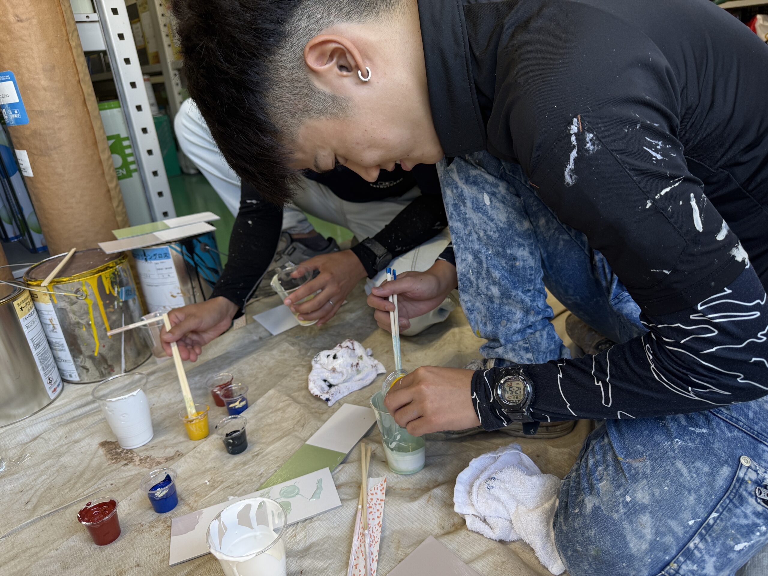 調色は塗装にとって基本的でありつつも重要な技術、吹き付けやコテも経験や技術が必要ですが、普段の現場では聞き出せない先輩のコツや知識をじっくり学べる良い機会です。