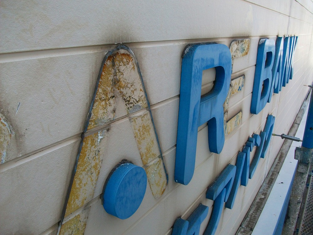 外壁の色褪せや鉄部のサビや文字看板の色褪せなどが起きている状態でした。