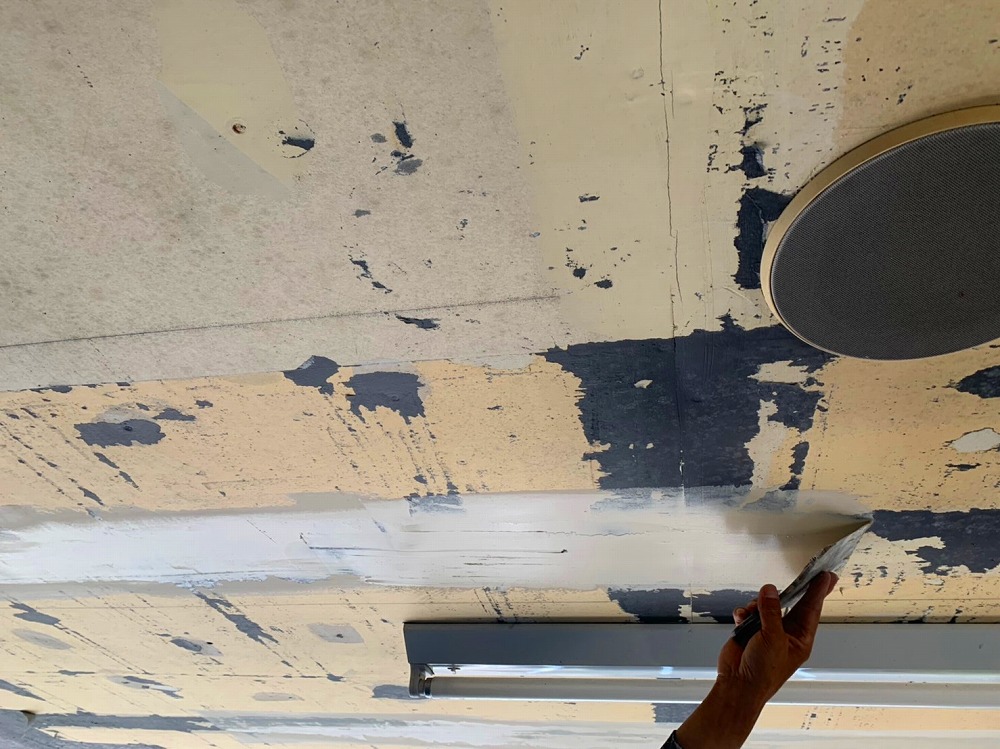 現場調査の結果、屋上から水が回り天井ボードが濡れることので、塗膜剥離やカビを引き起こしていました。