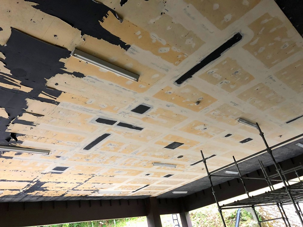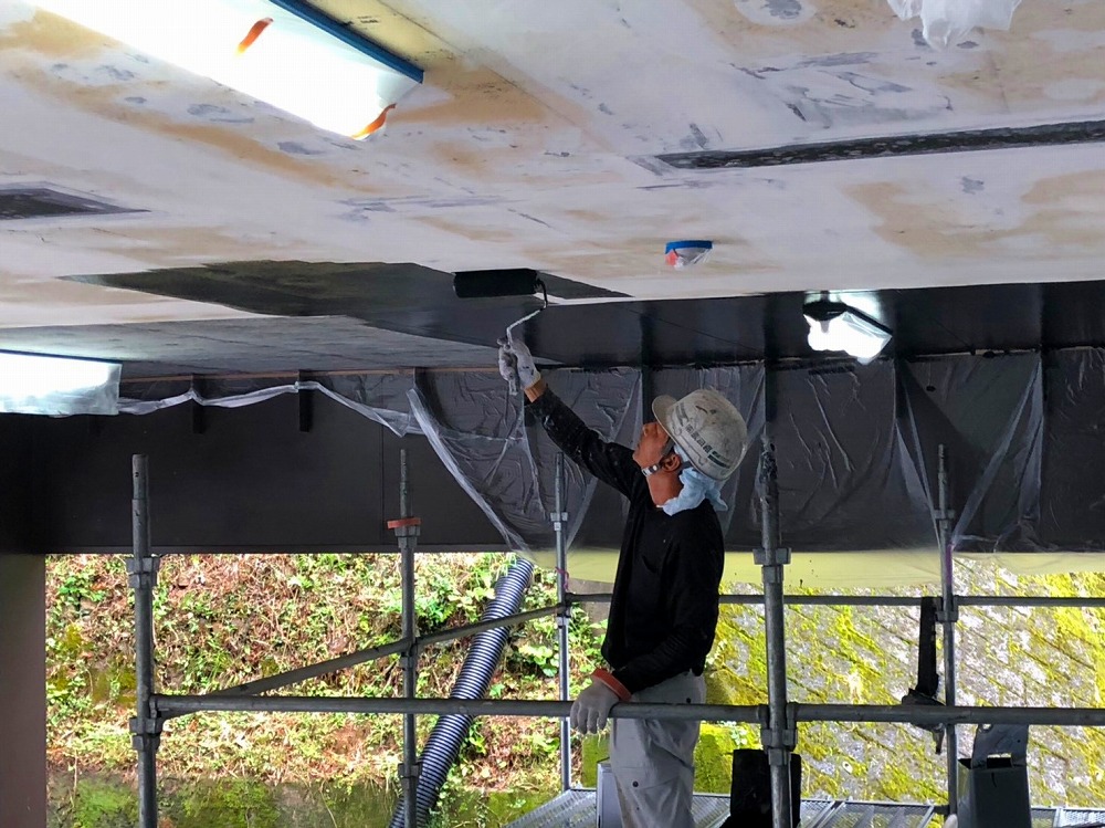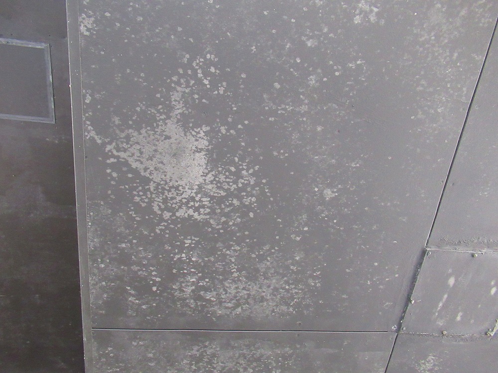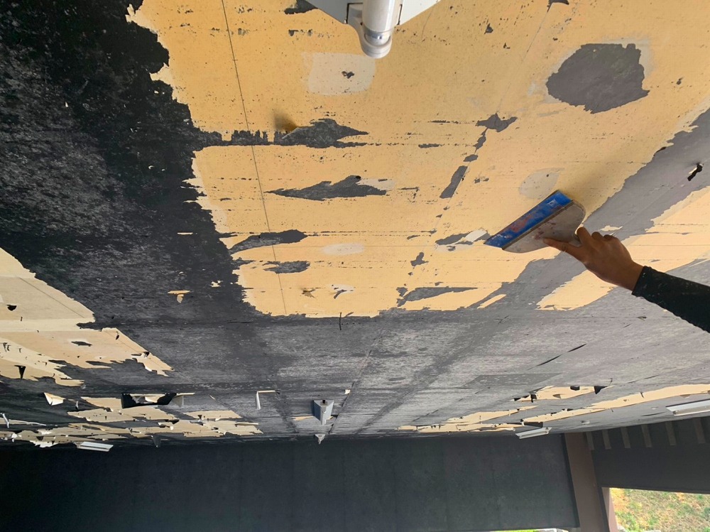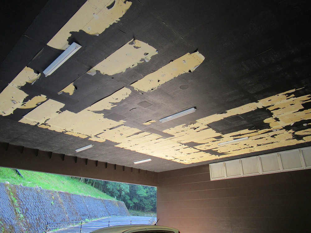駐車場ピロティー天井の塗装塗膜がほぼ全体にかけて剝がれ、カビも発生している状態でした。