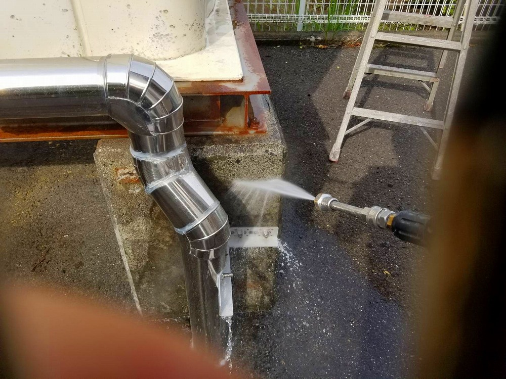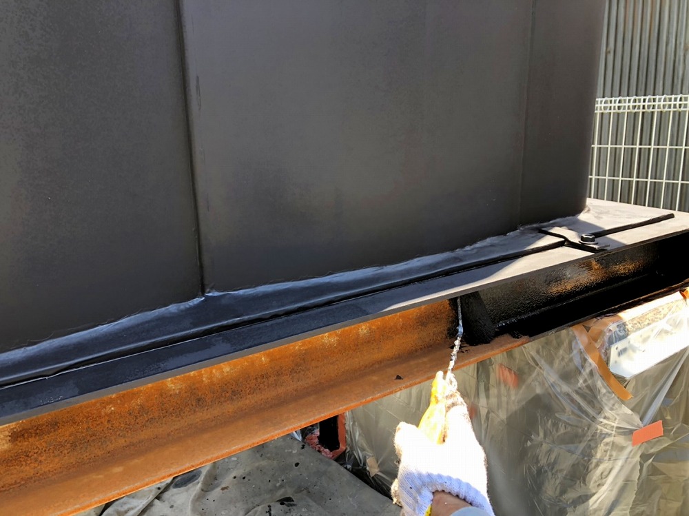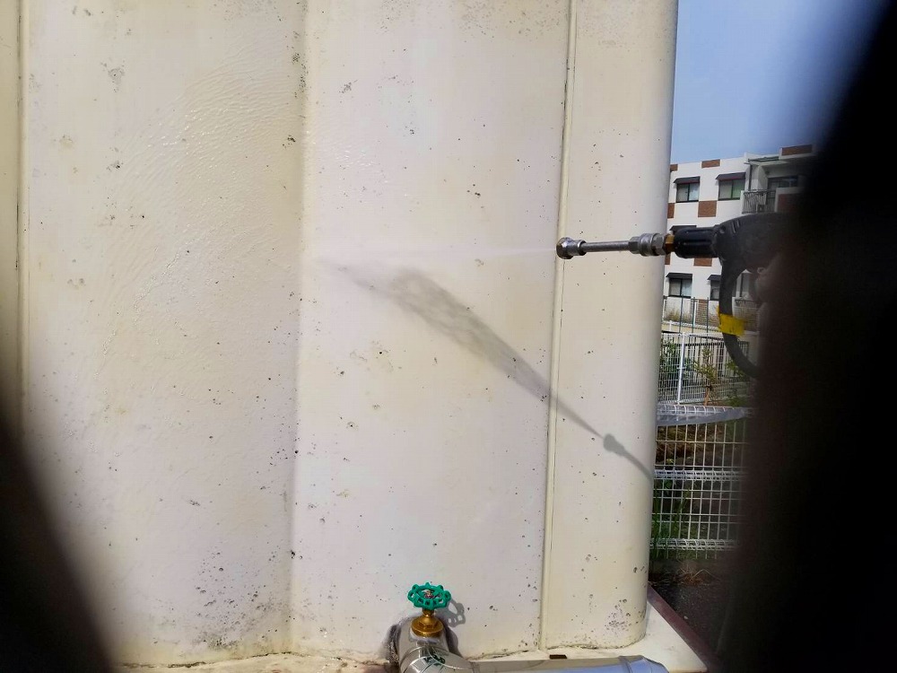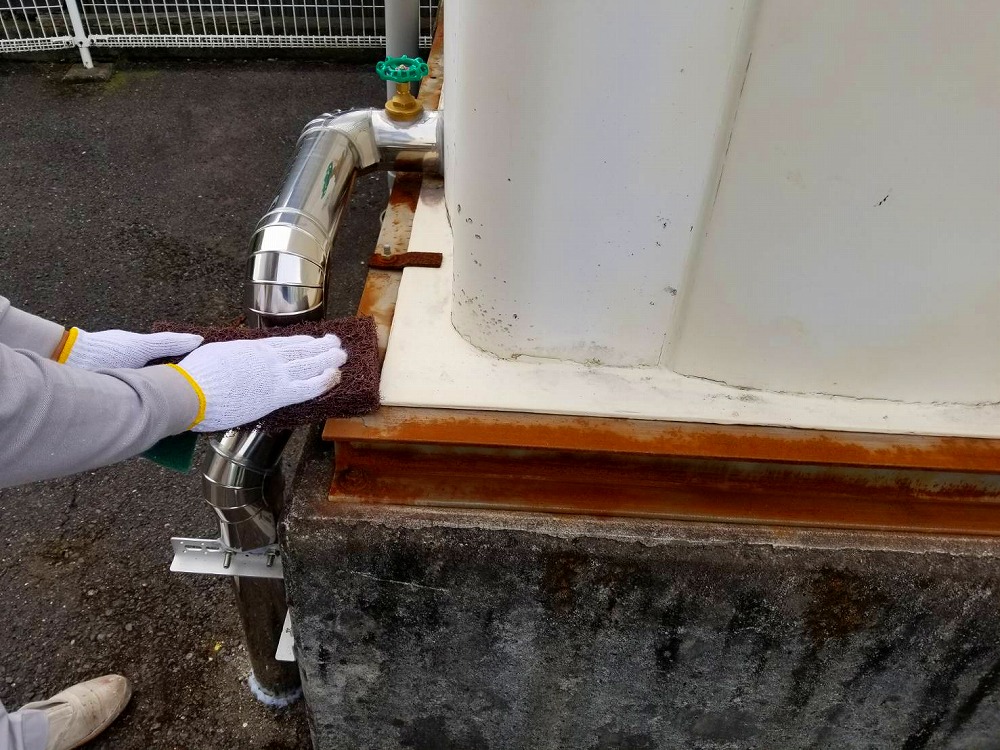 貯水槽はチョーキング現象、架台の鉄部は発錆が起きている状態でした。