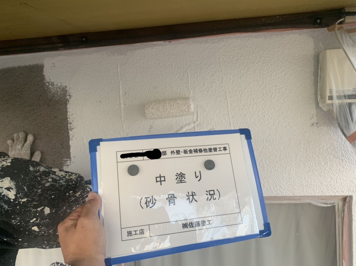 外壁のひび割れが多く見られたため中塗りの材料を微弾性フィラーを使用しました。微弾性フィラーとは壁表面の細かいひび割れの隙間を埋めてくれ、塗料に弾性を持たせる働きがあり更なるひび割れの発生を予防してくれます。また、外壁全体のひび割れや凸凹した面が多かったため、塗料を厚りで仕上げるマスチック仕上げで施工しています。