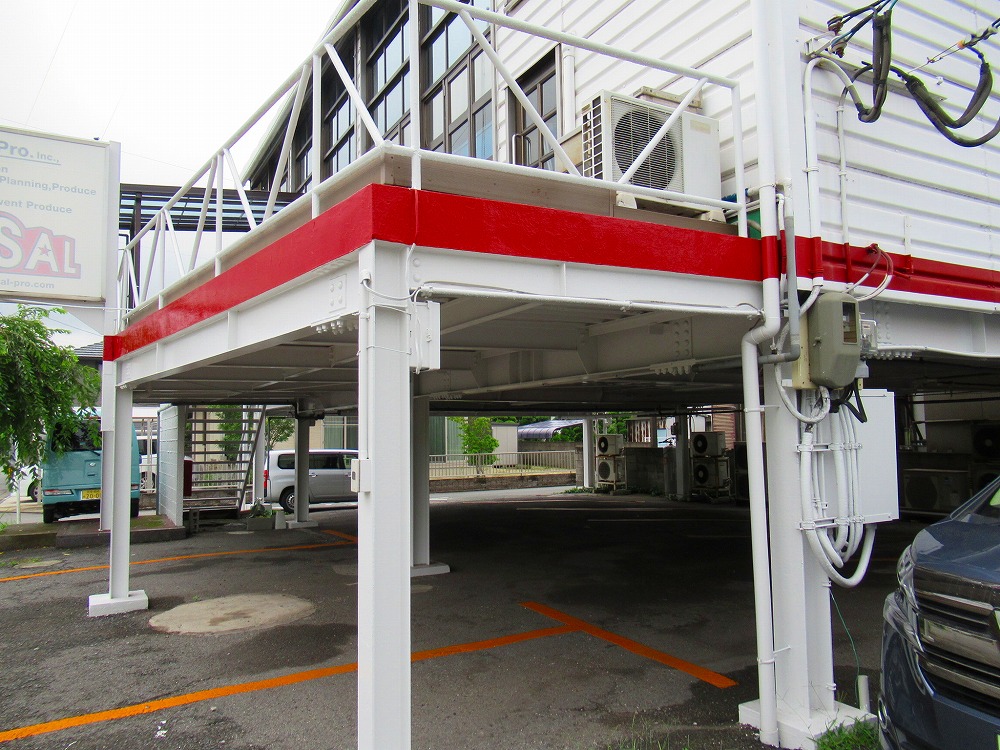 大分市にあるサルプロ様よりご依頼いただき駐車場鉄骨塗装、外部デッキ取替え・外部テラス取替え工事を行いました。