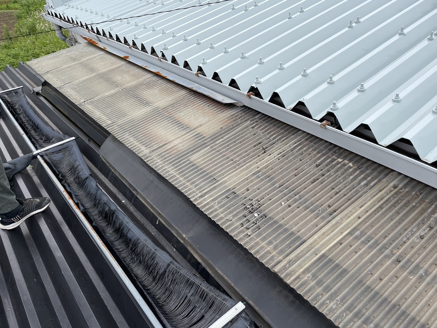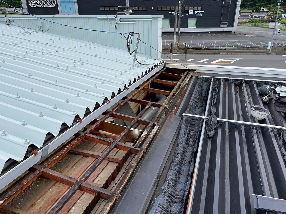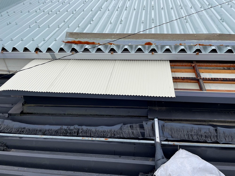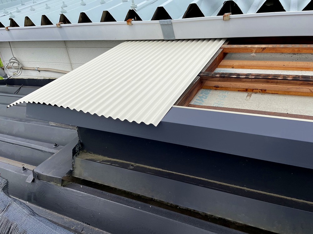 波板の下は倉庫になっており、出来るだけ暑くならないようにできればとの相談を受け遮熱タイプのガルバリウム鋼板を張らせていただきました。