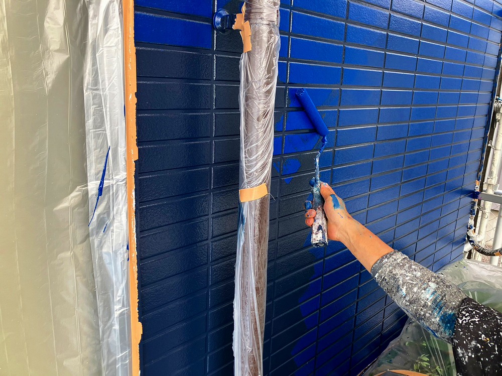 今回外壁はツートンカラーで仕上げましたが、下の紺色部分はダブルトーン工法というすごくお洒落で立体感が出る工法で仕上げさせていただきました。
