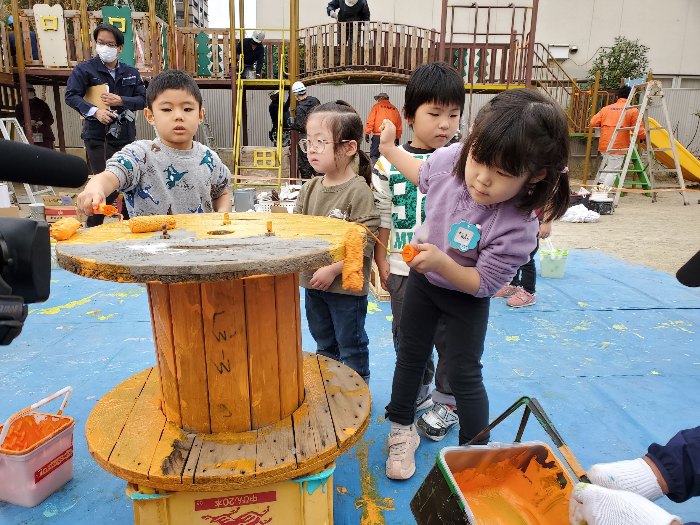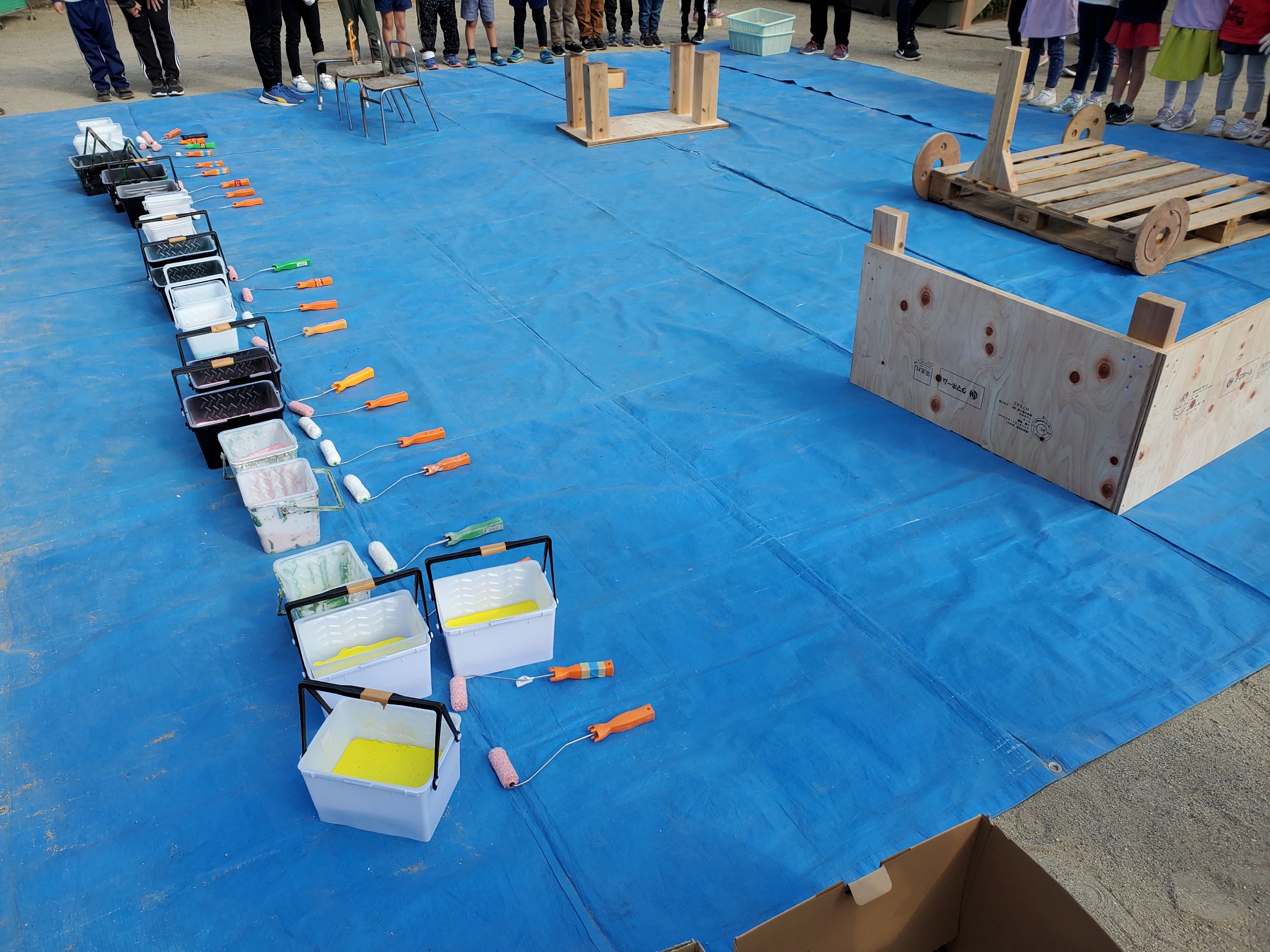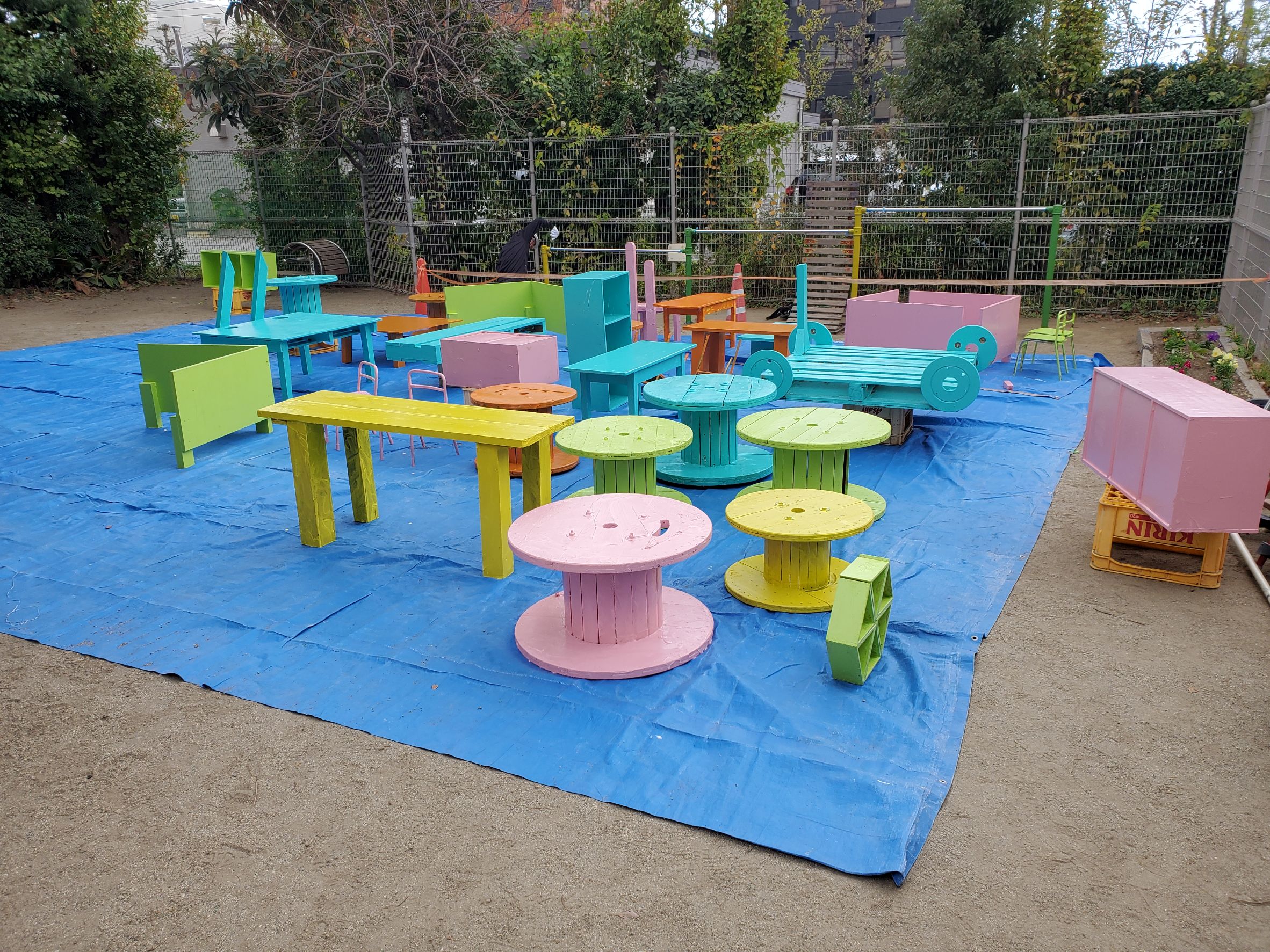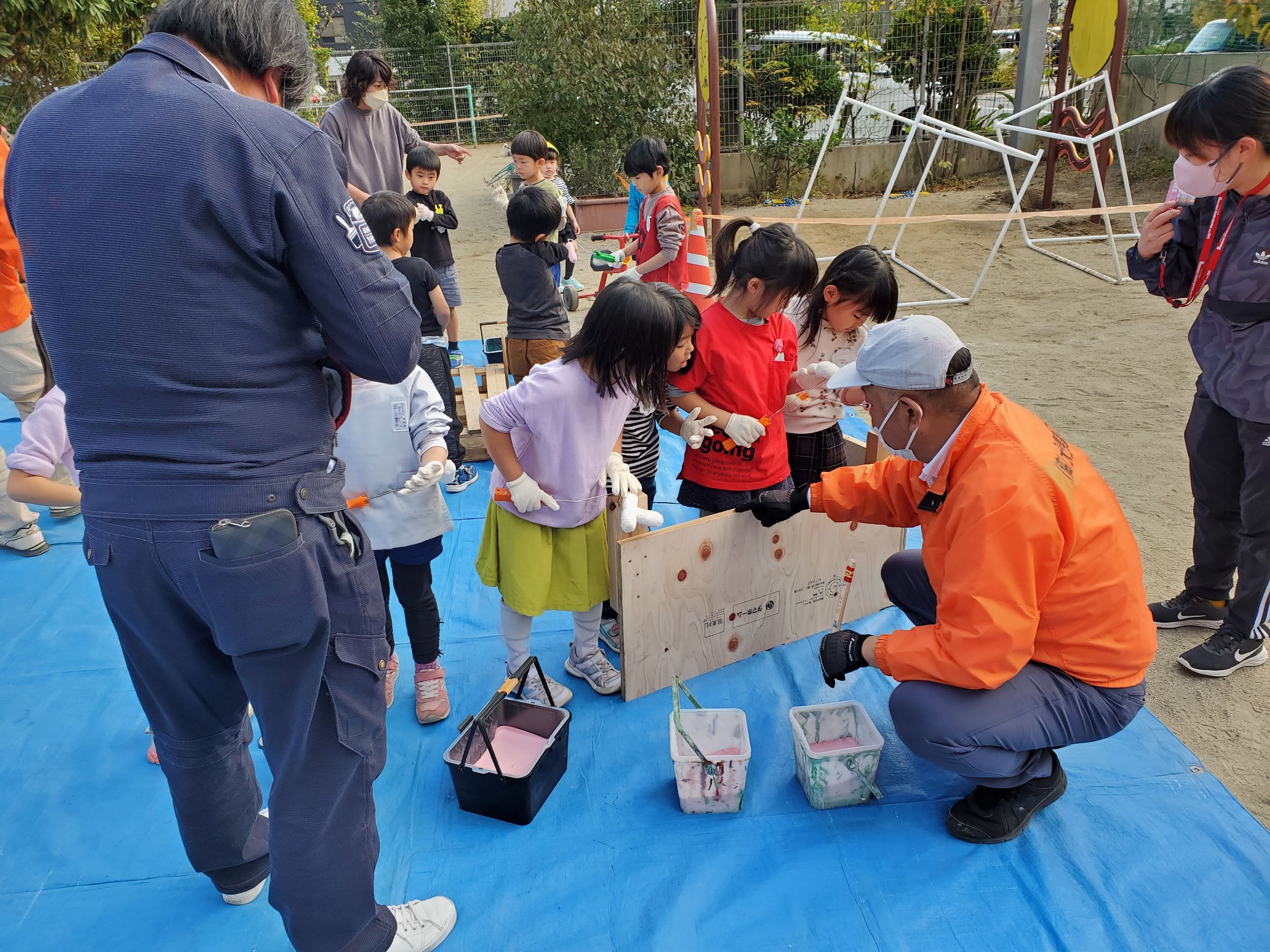 遊具、棚、机、椅子などを刷毛やローラー使ってみんなで楽しく塗装してもらいました。