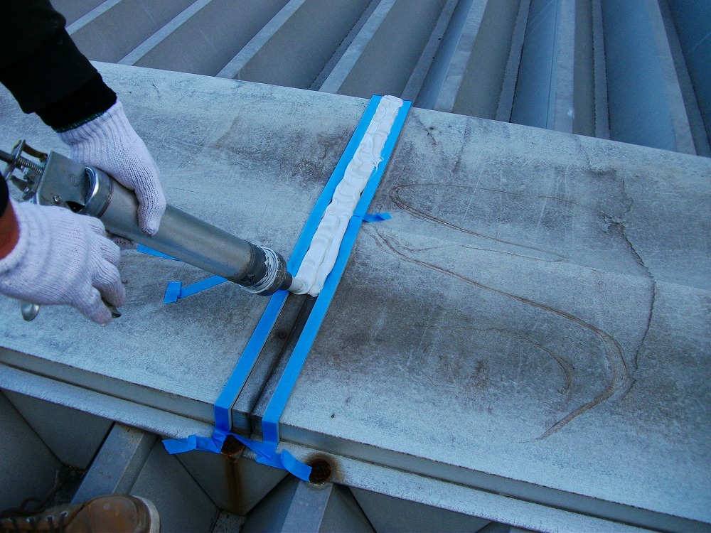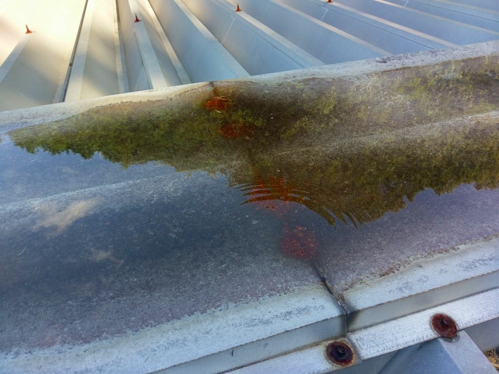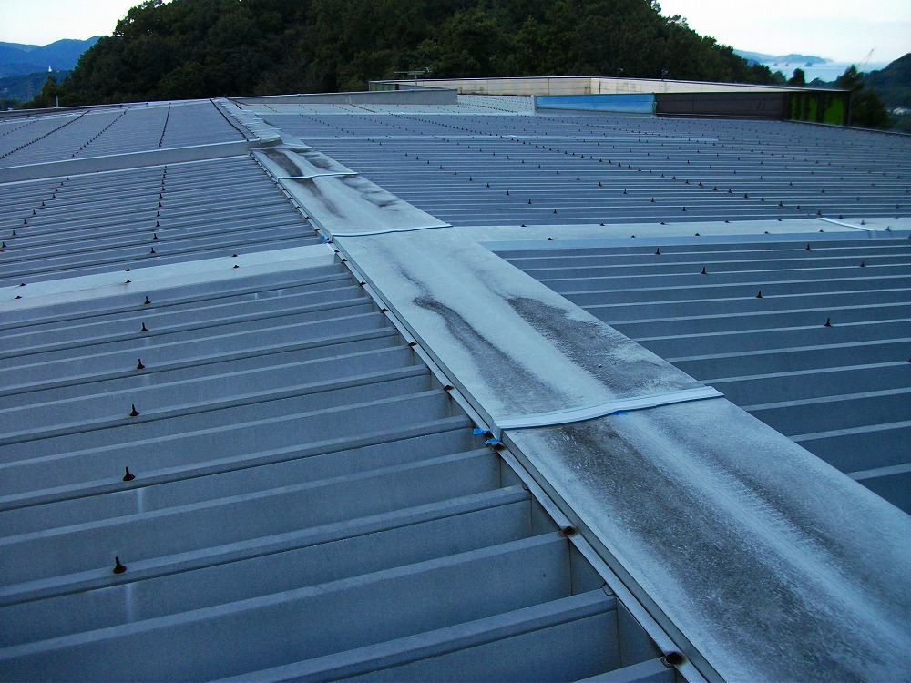 屋根折板との接合部部の板金も凹んで水が溜まっていたり、接合部が劣化していたりとこちらも漏水原因でした。